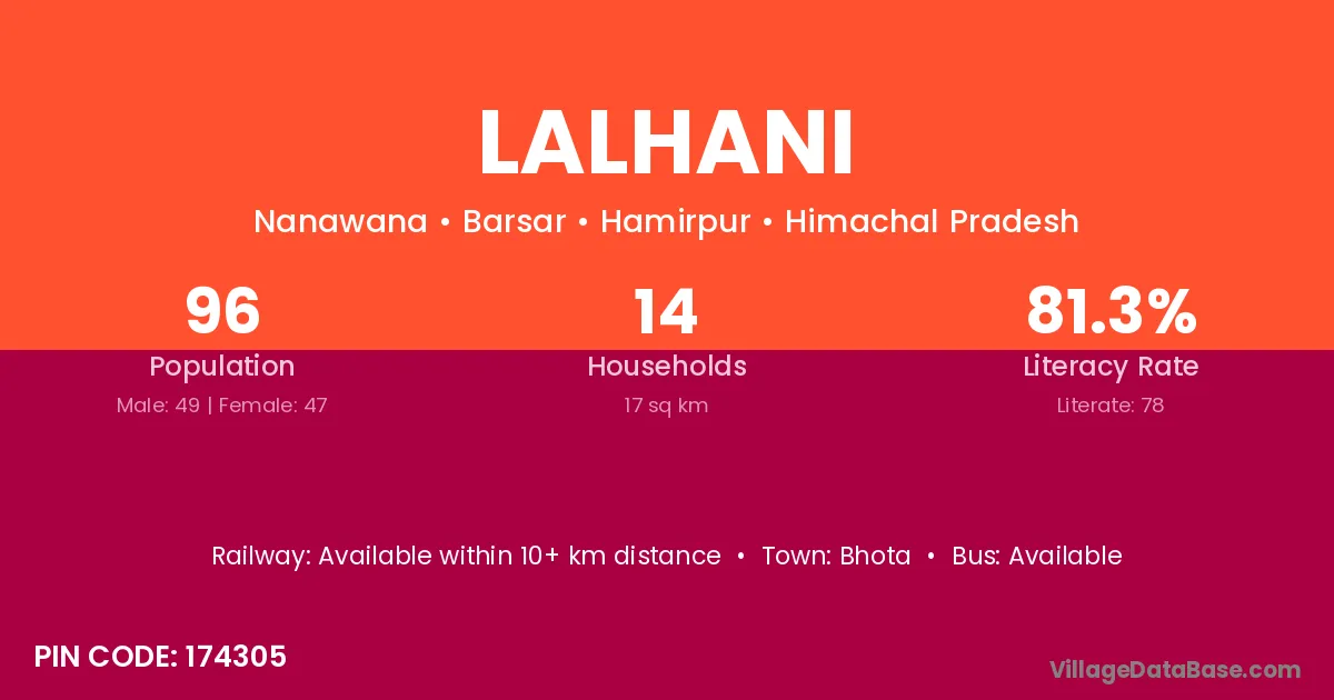 Lalhani village has a total population of 96 people, of which 49 are males and 47 are females.