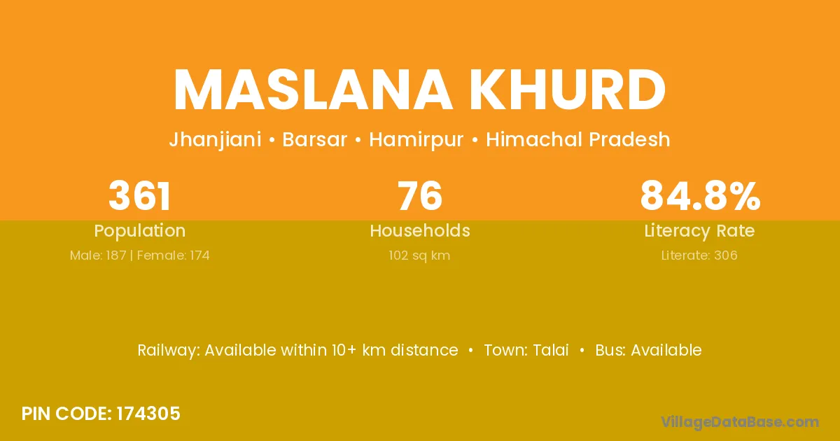 Maslana Khurd village has a total population of 361 people, of which 187 are males and 174 are females.