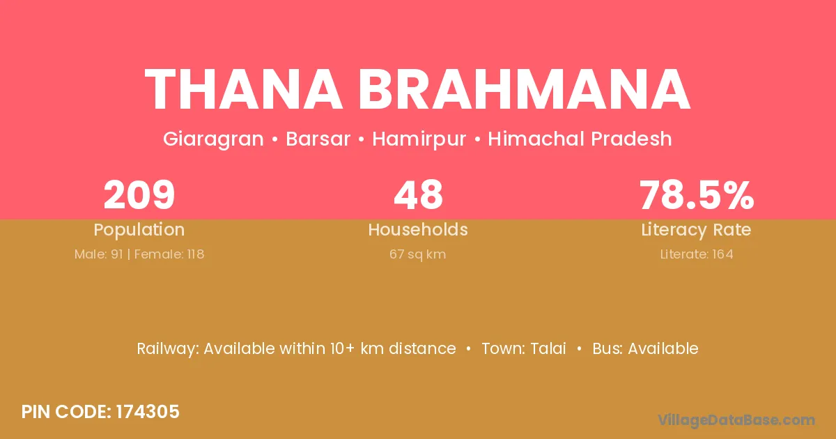 Thana Brahmana village has a total population of 209 people, of which 91 are males and 118 are females.