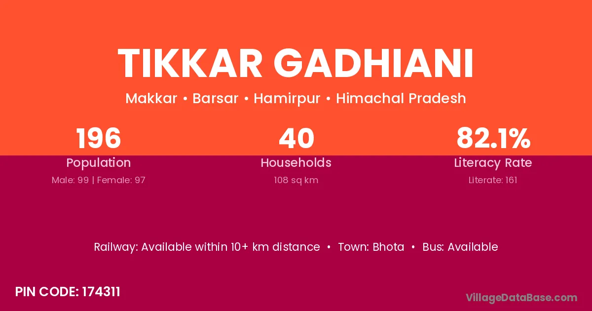 Tikkar Gadhiani village has a total population of 196 people, of which 99 are males and 97 are females.