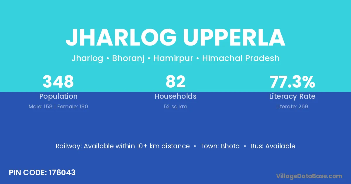 Jharlog Upperla village has a total population of 348 people, of which 158 are males and 190 are females.