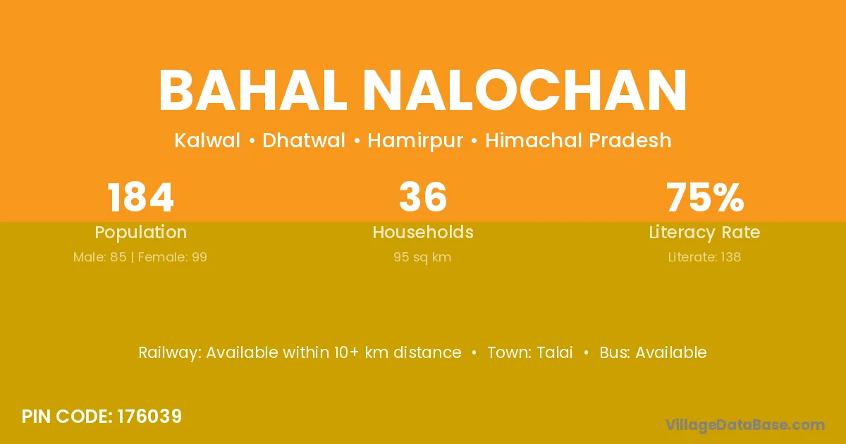 Bahal Nalochan village has a total population of 184 people, of which 85 are males and 99 are females.