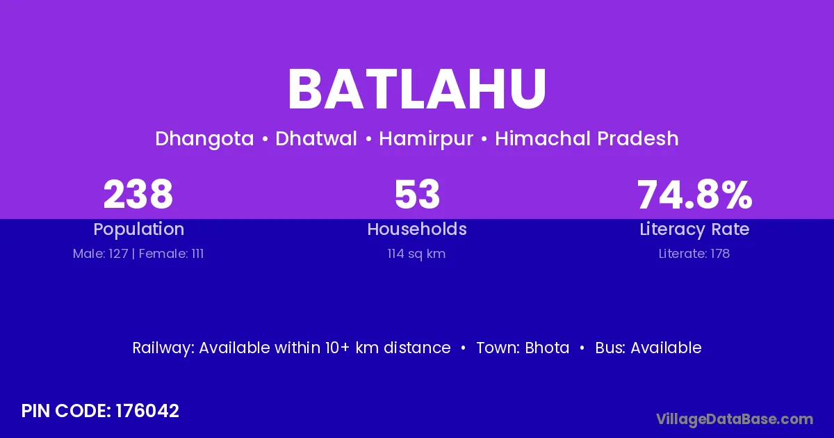 Batlahu village has a total population of 238 people, of which 127 are males and 111 are females.