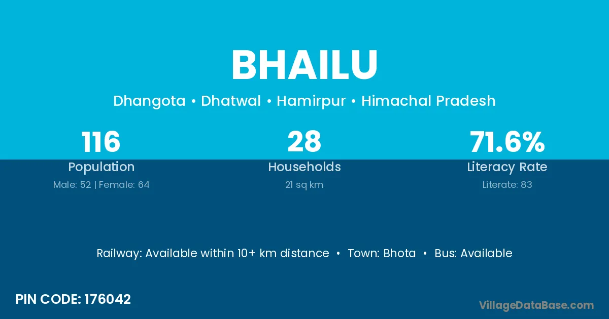 Bhailu village has a total population of 116 people, of which 52 are males and 64 are females.