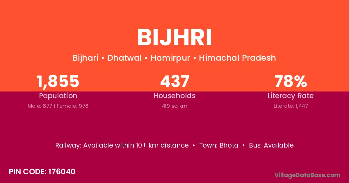 Bijhri village has a total population of 1,855 people, of which 877 are males and 978 are females.