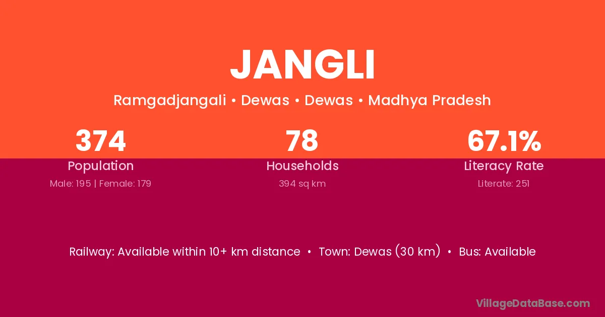 The literacy rate of Jangli village is 75.38%. Male literacy stands at 69.81% and female literacy at 79.22%.