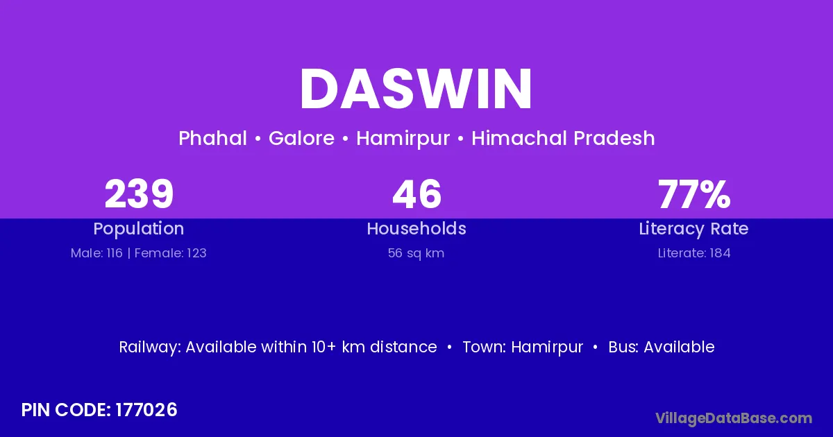 Daswin village has a total population of 239 people, of which 116 are males and 123 are females.