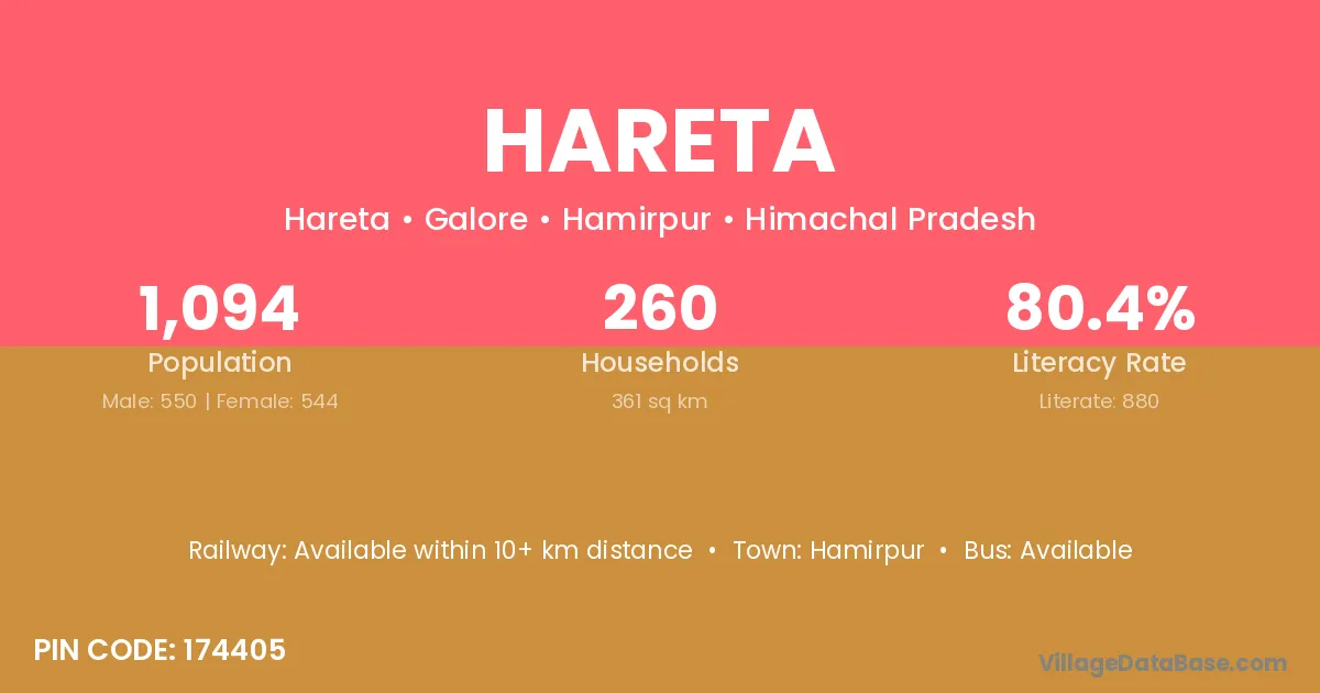 Hareta village has a total population of 1,094 people, of which 550 are males and 544 are females.
