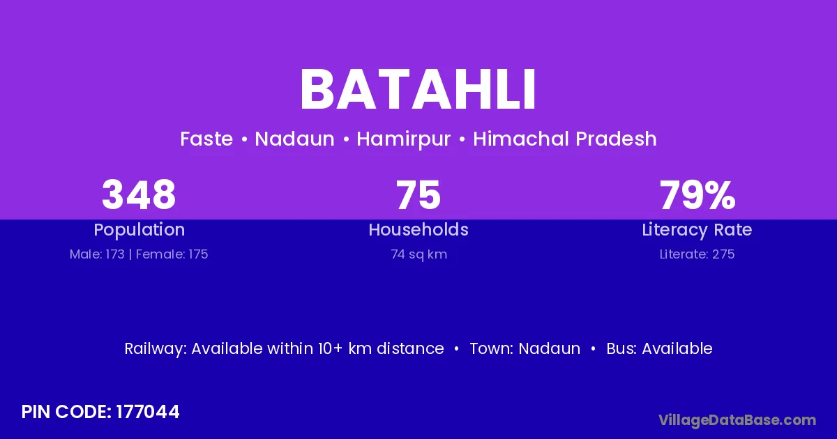 Batahli village has a total population of 348 people, of which 173 are males and 175 are females.