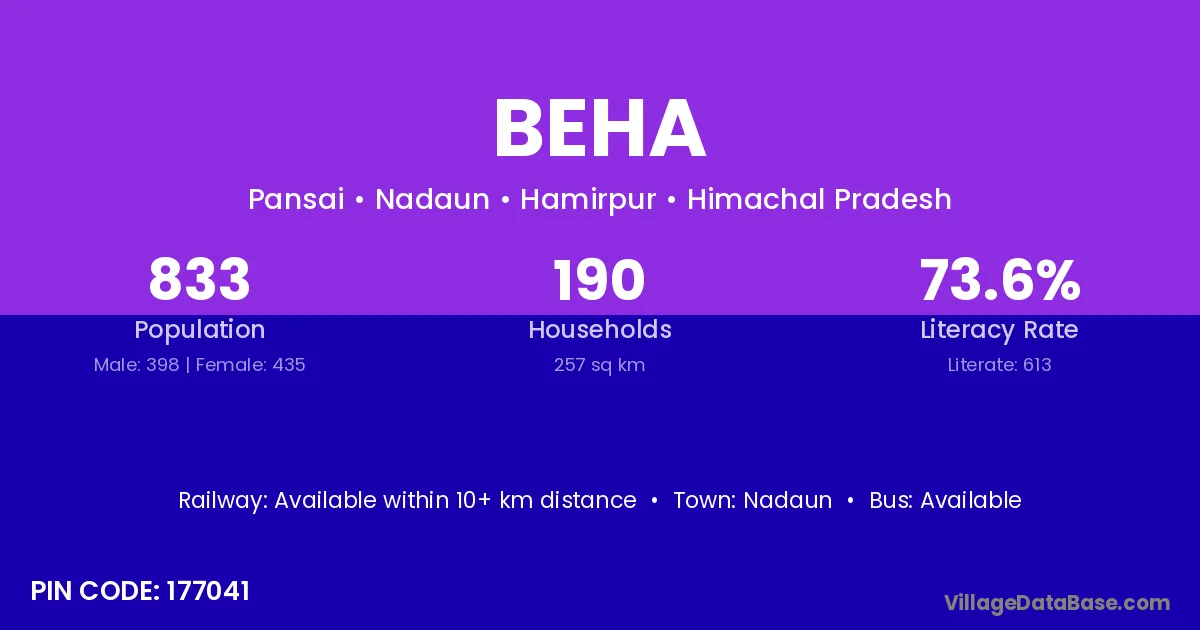 According to Census 2011 information, the village code of Beha village is 177041.