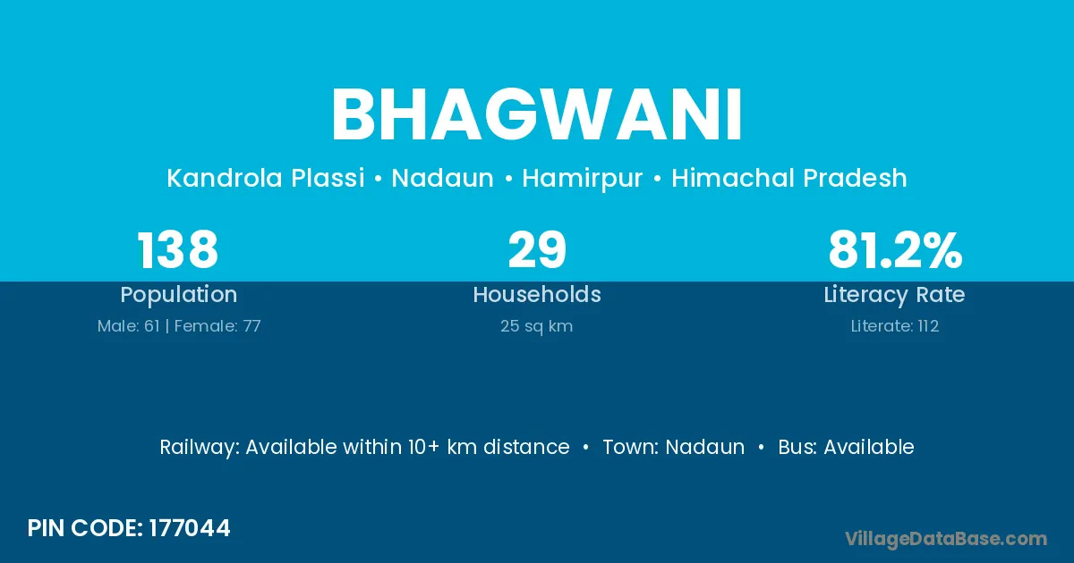 Bhagwani village has a total population of 138 people, of which 61 are males and 77 are females.