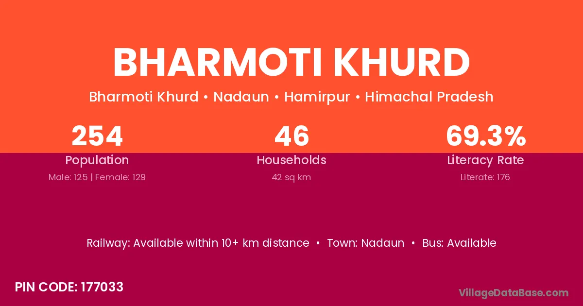 Bharmoti Khurd village has a total population of 254 people, of which 125 are males and 129 are females.