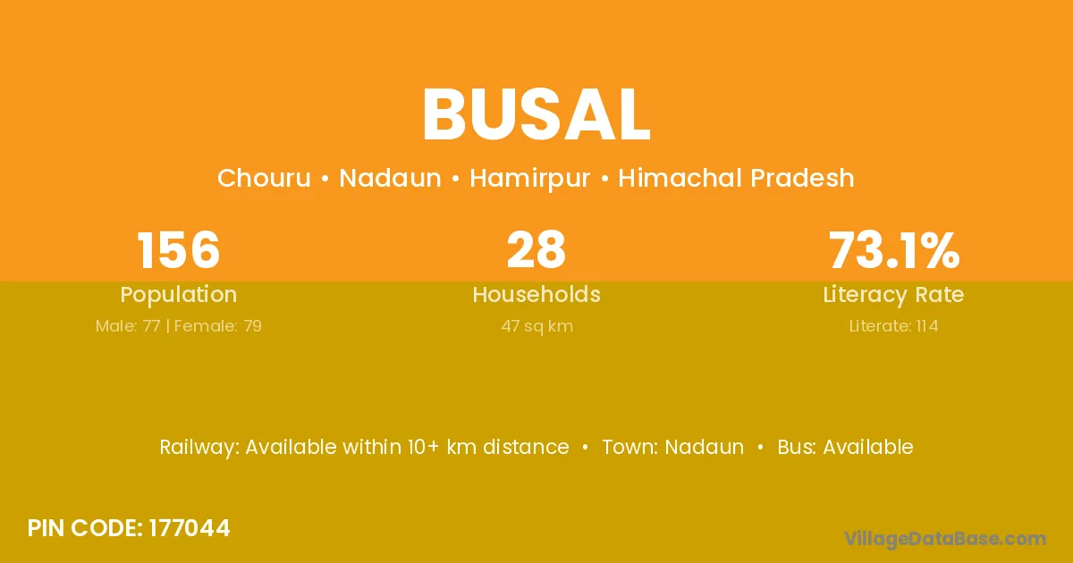 Busal village has a total population of 156 people, of which 77 are males and 79 are females.