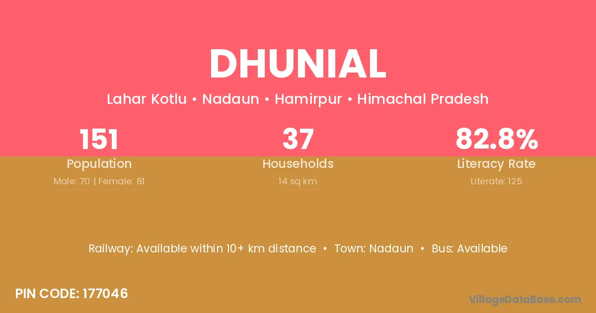 Dhunial village has a total population of 151 people, of which 70 are males and 81 are females.
