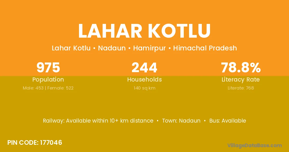 Lahar Kotlu village has a total population of 975 people, of which 453 are males and 522 are females.
