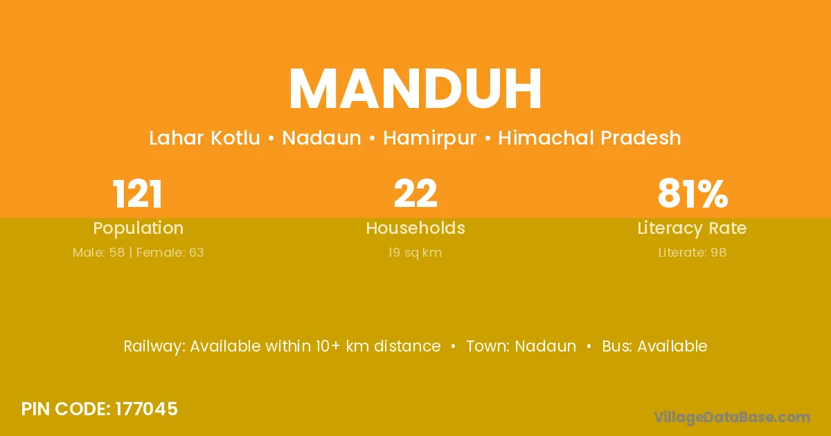 Manduh village has a total population of 121 people, of which 58 are males and 63 are females.