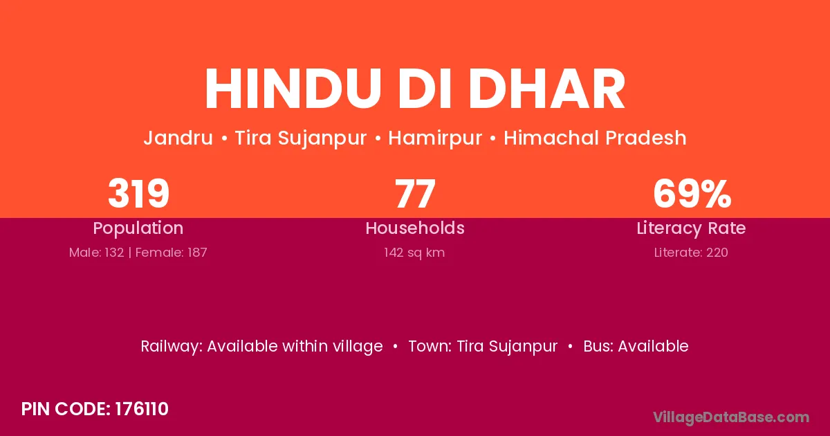 Hindu Di Dhar village has a total population of 319 people, of which 132 are males and 187 are females.