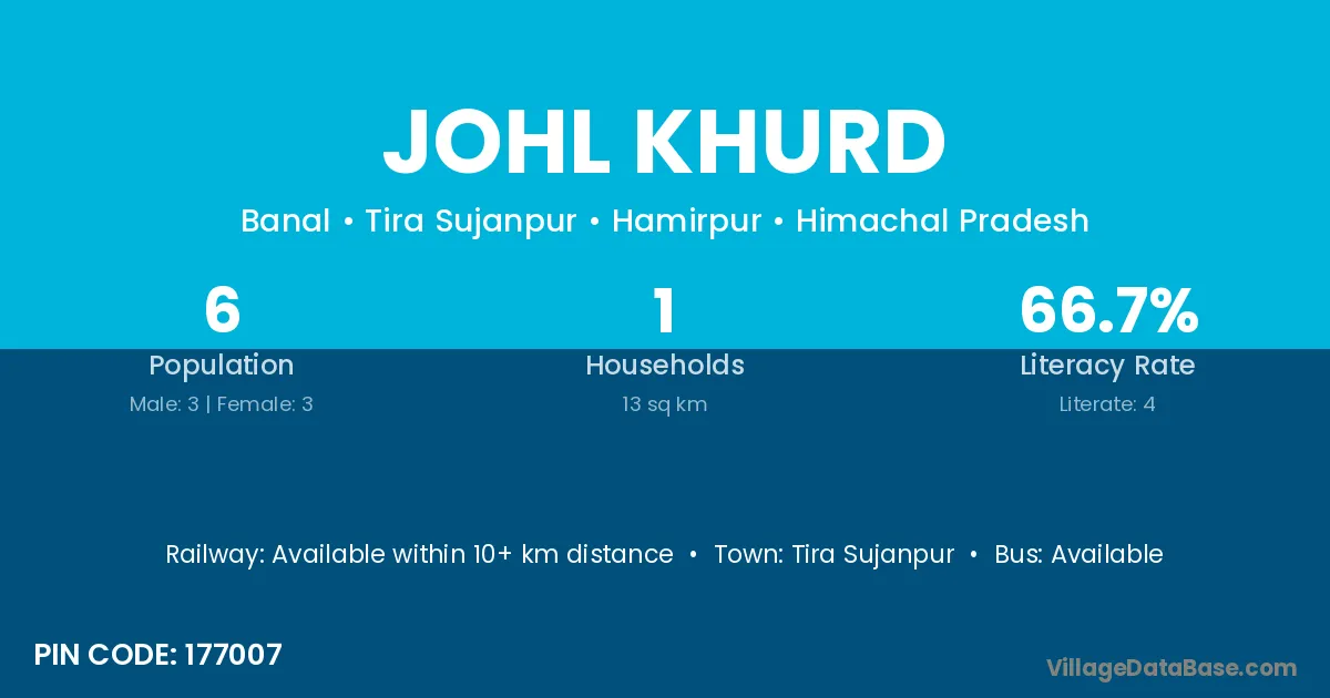 Johl Khurd village has a total population of 6 people, of which 3 are males and 3 are females.