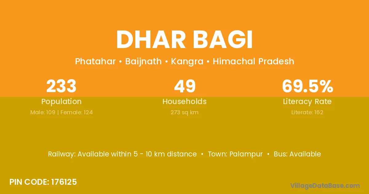 Palampur is the nearest town to Dhar Bagi village for major economic activities