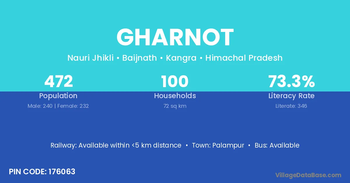 Gharnot village has a total population of 472 people, of which 240 are males and 232 are females.