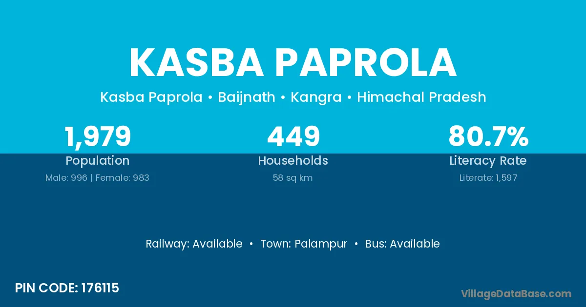Kasba Paprola village has a total population of 1,979 people, of which 996 are males and 983 are females.