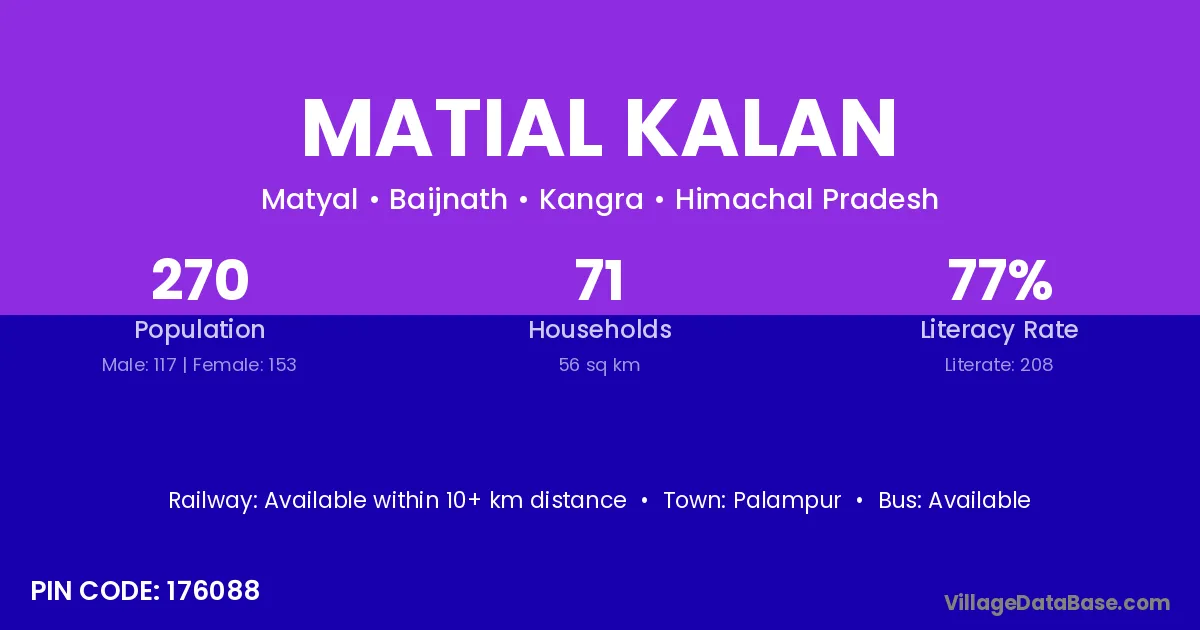 Palampur is the nearest town to Matial Kalan village for major economic activities