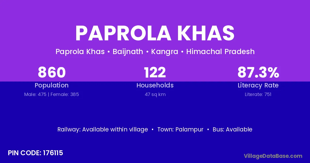 Paprola Khas village has a total population of 860 people, of which 475 are males and 385 are females.