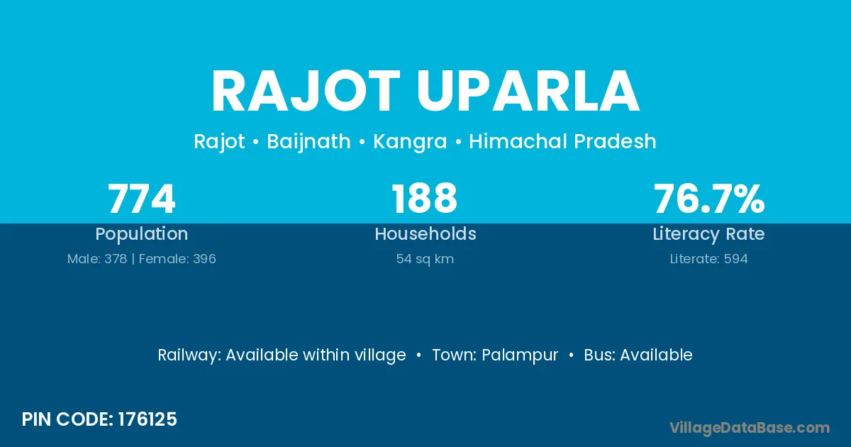 Palampur is the nearest town to Rajot Uparla village for major economic activities