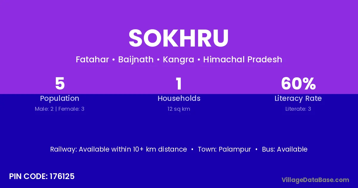 Sokhru village has a total population of 5 people, of which 2 are males and 3 are females.