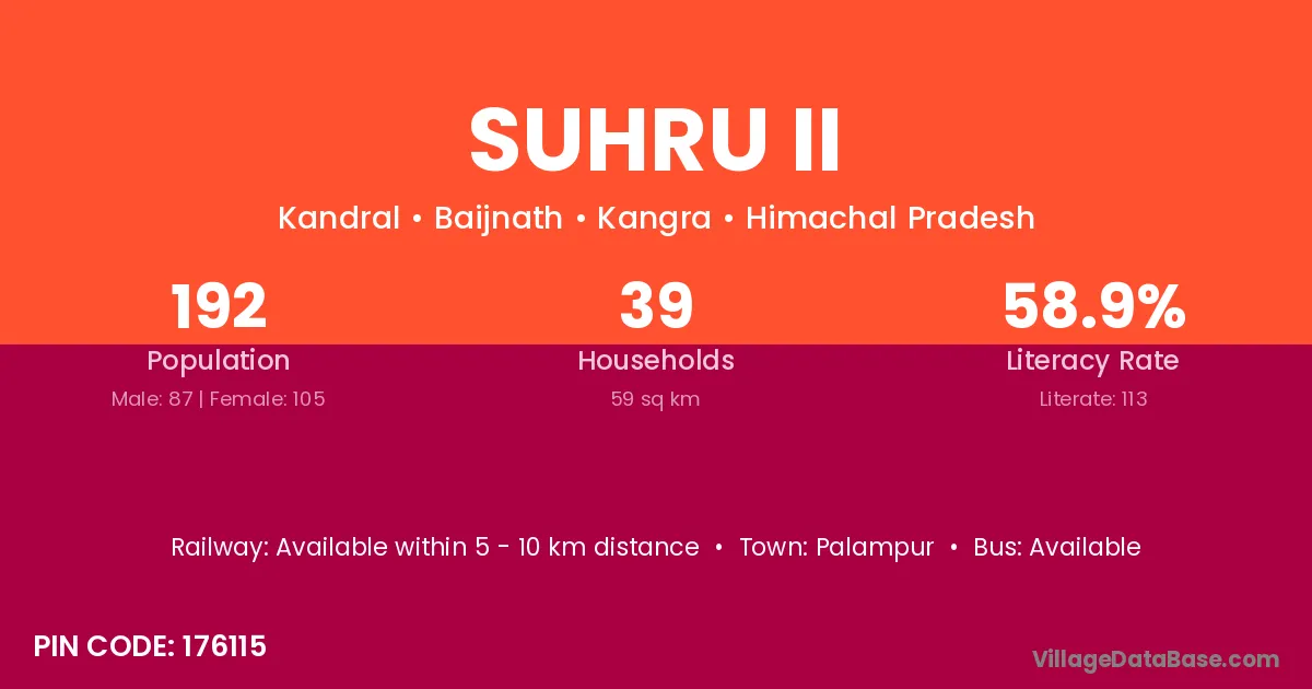 Suhru Ii village has a total population of 192 people, of which 87 are males and 105 are females.