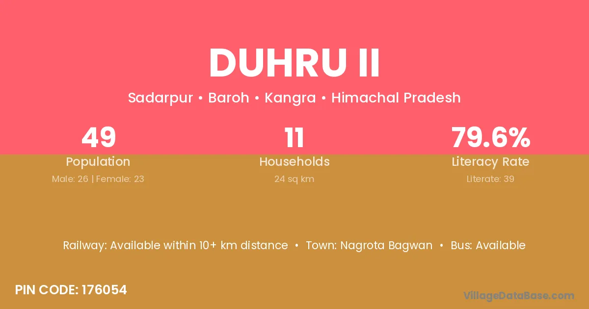 Duhru Ii village has a total population of 49 people, of which 26 are males and 23 are females.