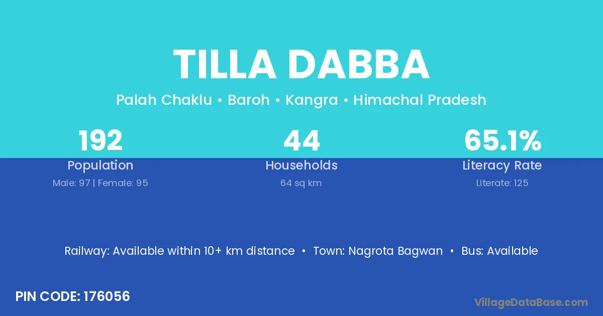 Nagrota Bagwan is the nearest town to Tilla Dabba village for major economic activities