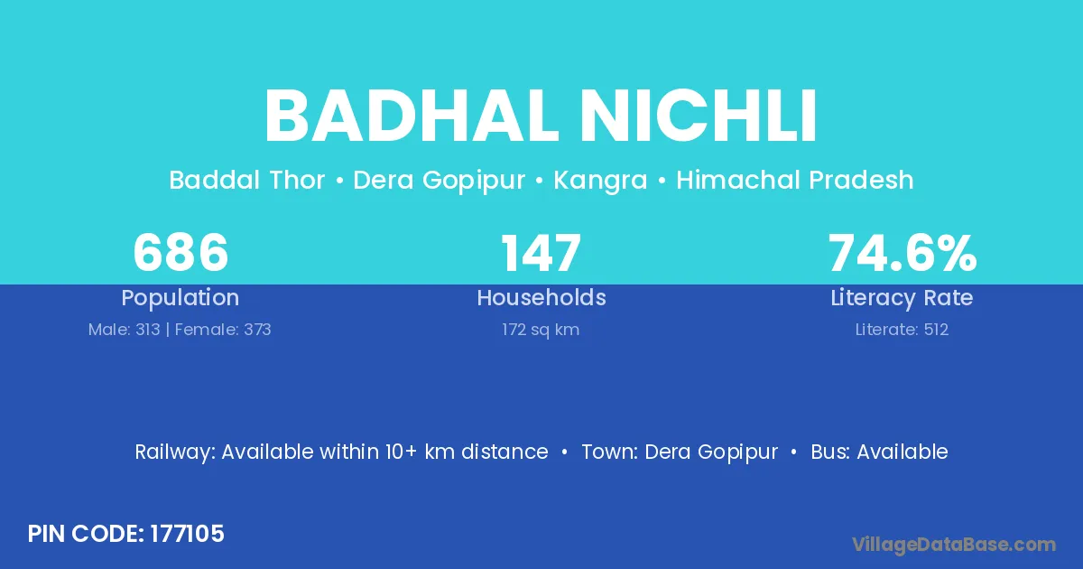 Badhal Nichli village has a total population of 686 people, of which 313 are males and 373 are females.