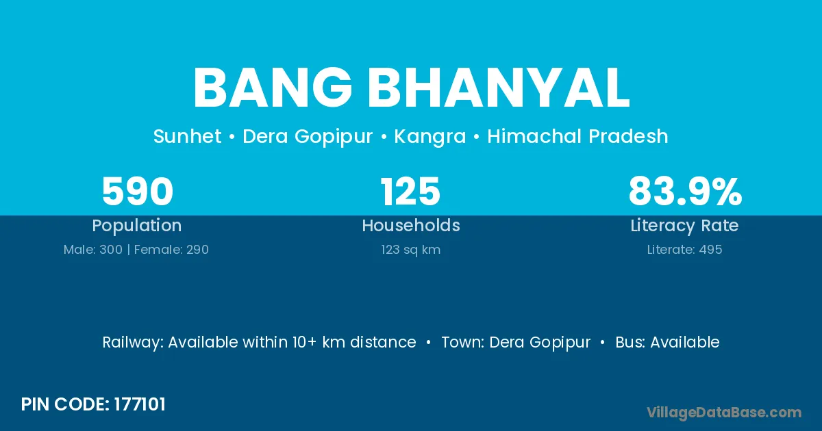 The literacy rate of Bang Bhanyal village is 83.90%. Male literacy stands at 89.67% and female literacy at 77.93%.