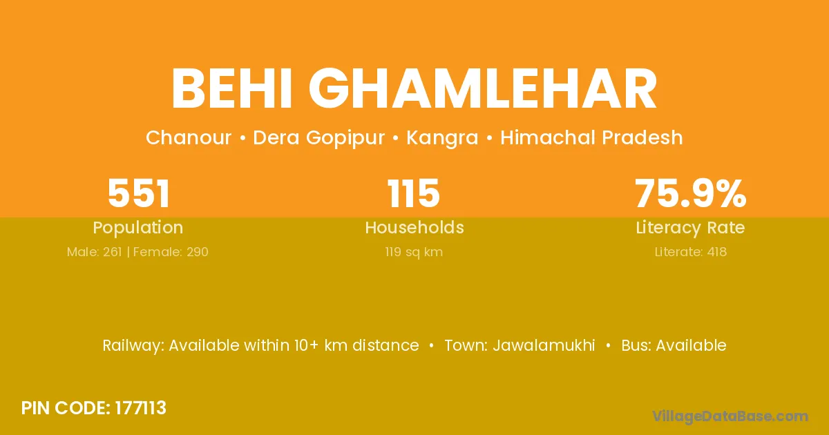 Jawalamukhi is the nearest town to Behi Ghamlehar village for major economic activities