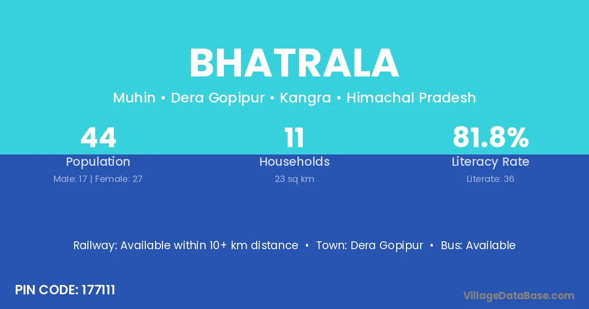 Bhatrala village has a total population of 44 people, of which 17 are males and 27 are females.