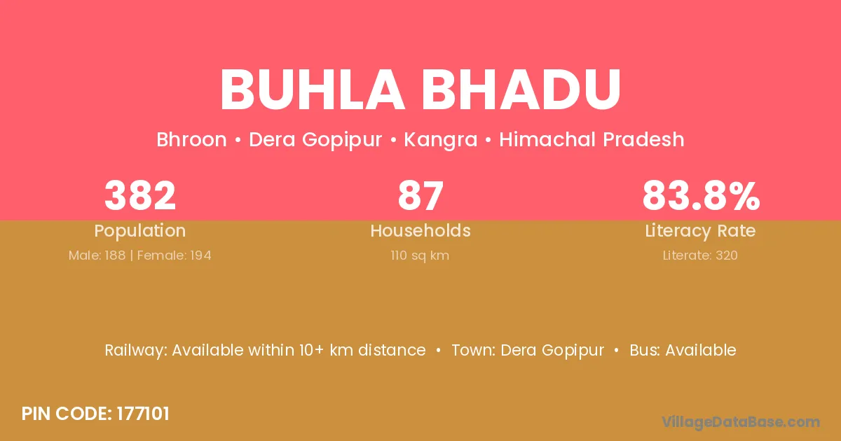 Buhla Bhadu village has a total population of 382 people, of which 188 are males and 194 are females.