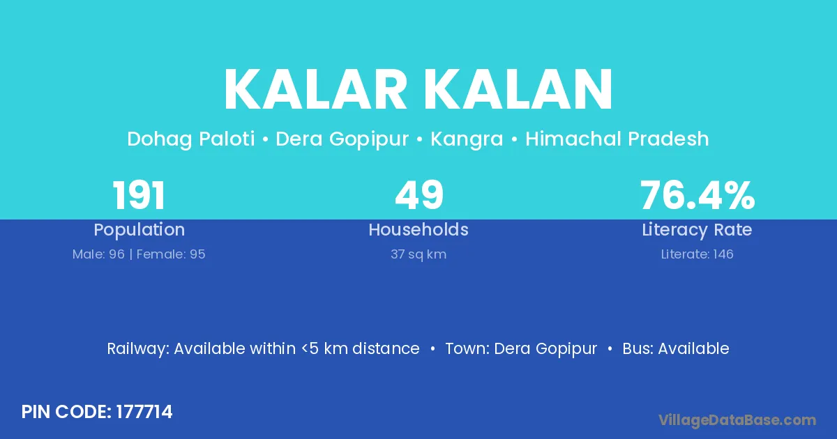 Kalar Kalan village has a total population of 191 people, of which 96 are males and 95 are females.
