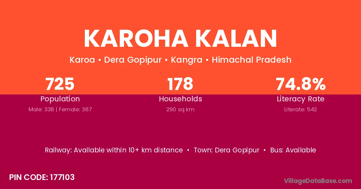 Karoha Kalan village has a total population of 725 people, of which 338 are males and 387 are females.
