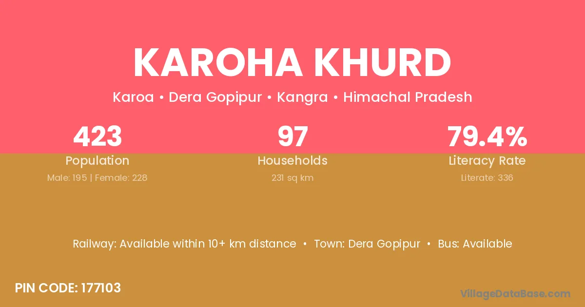 Karoha Khurd village has a total population of 423 people, of which 195 are males and 228 are females.