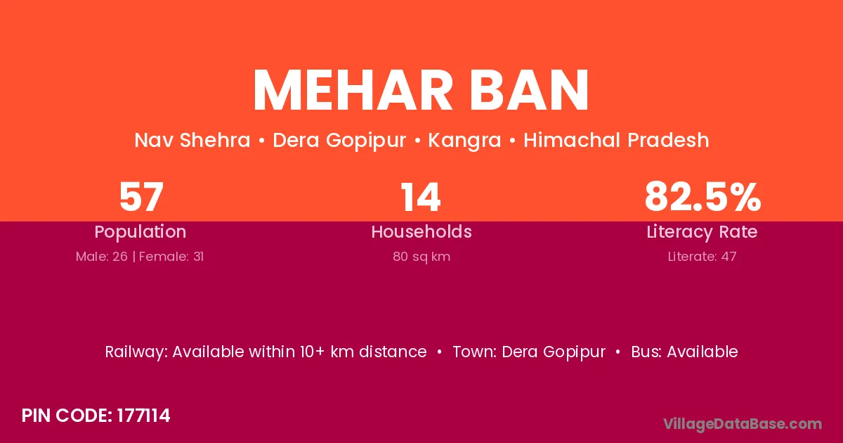 Mehar Ban village has a total population of 57 people, of which 26 are males and 31 are females.