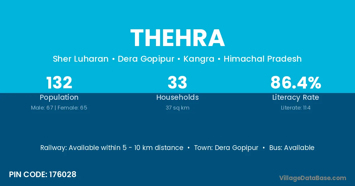 Thehra village has a total population of 132 people, of which 67 are males and 65 are females.
