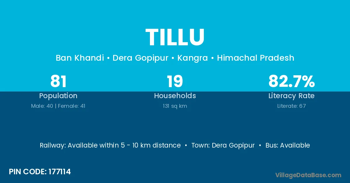 Tillu village has a total population of 81 people, of which 40 are males and 41 are females.