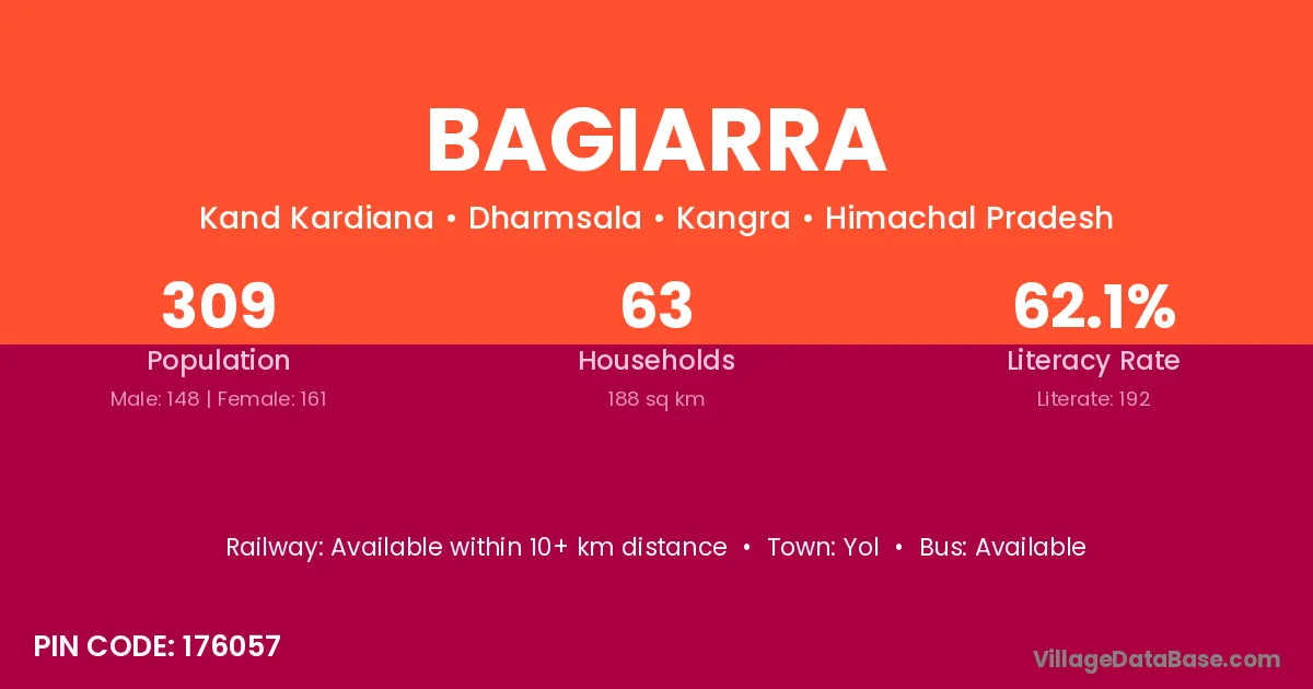 Bagiarra village has a total population of 309 people, of which 148 are males and 161 are females.