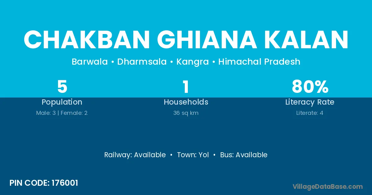 Chakban Ghiana Kalan village has a total population of 5 people, of which 3 are males and 2 are females.