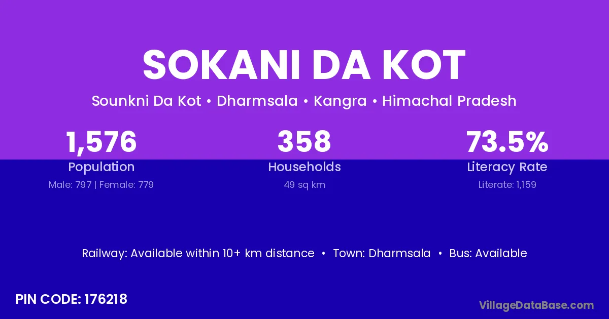 Sokani Da Kot village has a total population of 1,576 people, of which 797 are males and 779 are females.