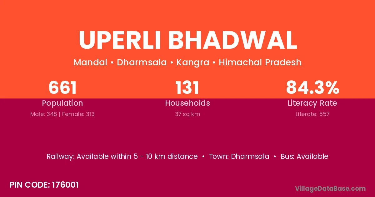 Uperli Bhadwal village has a total population of 661 people, of which 348 are males and 313 are females.
