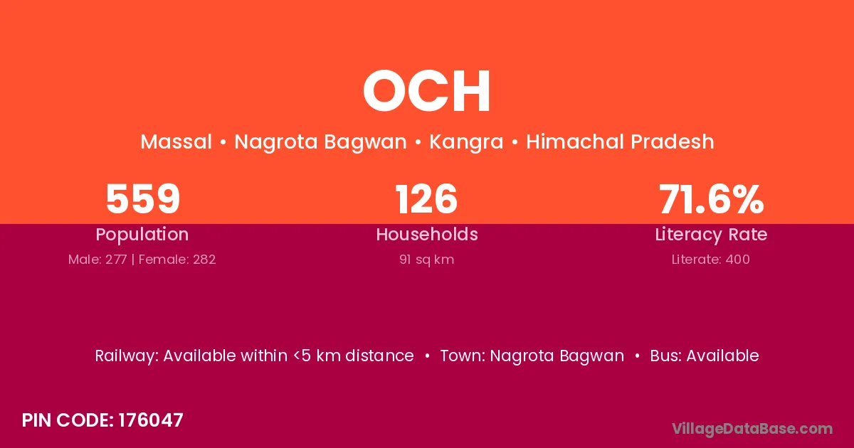 The literacy rate of Och village is 78.85%. Male literacy stands at 80.85% and female literacy at 77.19%.