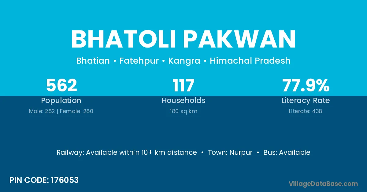 Bhatoli Pakwan village has a total population of 562 people, of which 282 are males and 280 are females.