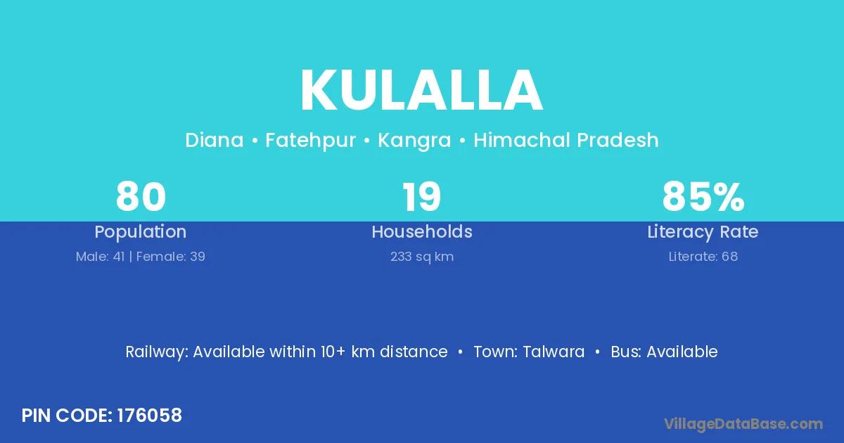 Kulalla village has a total population of 80 people, of which 41 are males and 39 are females.
